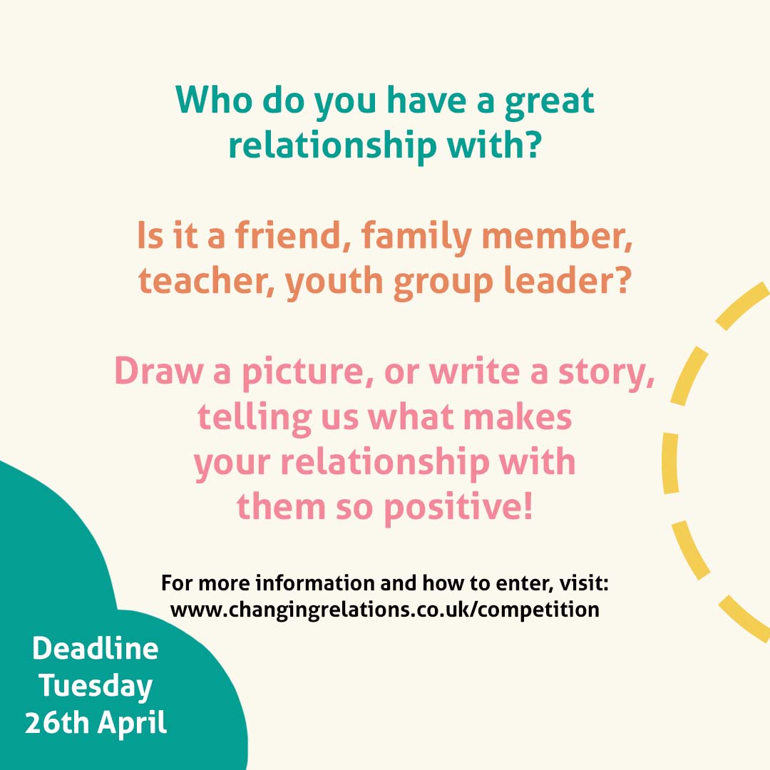Prizes in total worth £250 for 1st, 2nd, 3rd places in each category. The overall winner will receive a £100 voucher for their school or organisation (i.e. youth group or community group). The 9 winners will be chosen by Changing Relations, with the overall winner decided by the public.