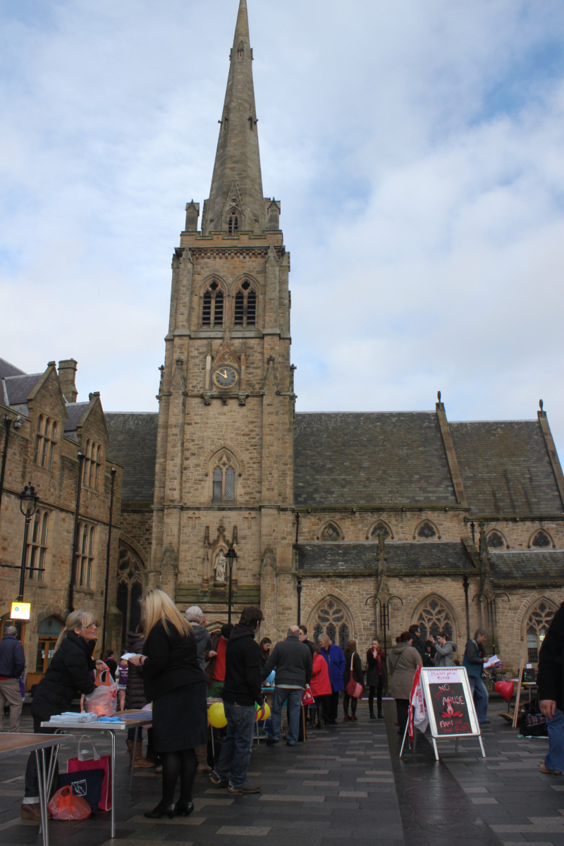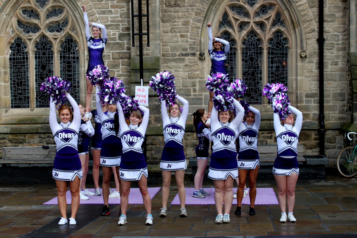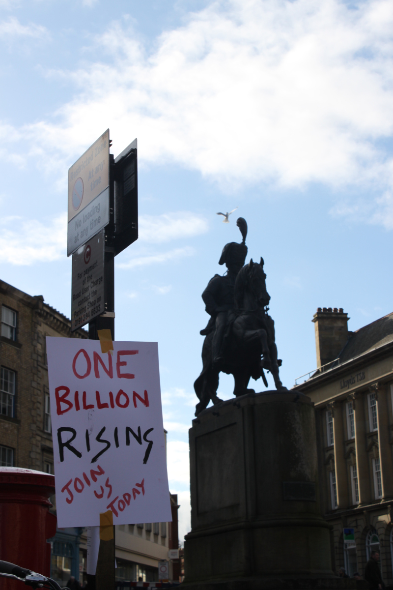 It’s been an inspiring day in the Market Square today in Durham. After weeks of hard work, the Durham One Billion Rising event came off brilliantly. Durham City Mayor opened the event and was followed by thought provoking speeches, rousing music, challenging and emotional poetry readings and upliftingly enthusiastic dancing from our invited dance group.